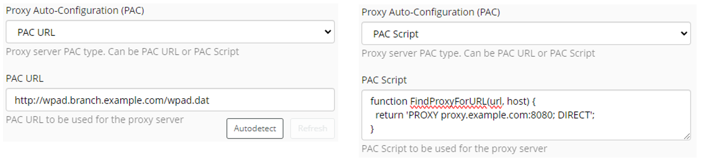 The PAC URL Refresh button will redownload the PAC file if a manual refresh is needed. PAC files automatically refresh hourly. It is only available if the URL is already configured.
