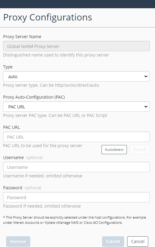 The PAC URL Autodetect button uses the Web Proxy Auto-Discovery (WPAD) protocol. You must still submit the settings for any discovered URL to take effect. If no URL is discovered, an error message will appear. This is similar to “Automatically detect settings” in most major operating systems. The main difference is that NetIM requires explicit confirmation of the discovered URL.