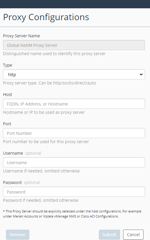 Proxy configurations are under Configure > All Settings > Administer: Proxy Settings. Use the settings to globally configure web proxy access to NetIM.