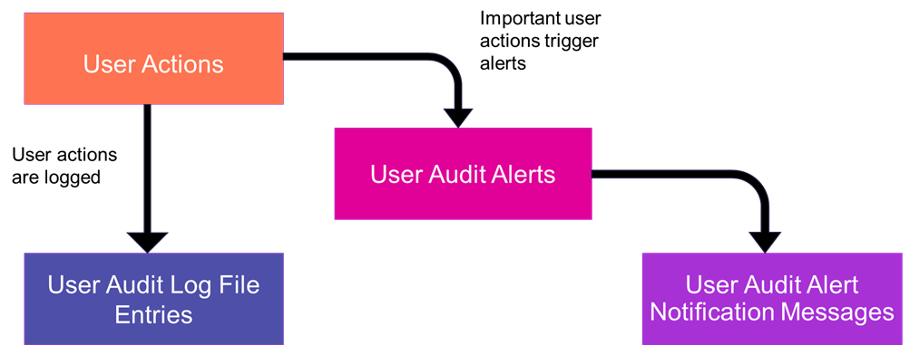 The following diagram shows the relationship between the components involved in user auditing. When user audit logging is enabled, an entry for each user command is written to the user audit log file. If the user audit alert profile is active, user audit alerts will be created for the key user command types. Furthermore, if the user audit alert profile is configured for notifications, then corresponding notification messages will be sent for each user audit alert.