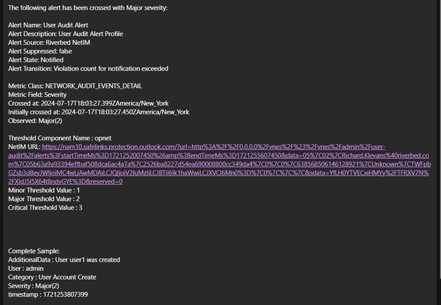 Notification messages for user audit alerts will be similar to metric violation alerts. The Category field will indicate which kind of event was detected, the AdditionalData field will give details of that event, and the User field will indicate which NetIM user performed the operation. The URL embedded in the notification message can be used to navigate back to the user audit alerts page to view the alert in more detail.