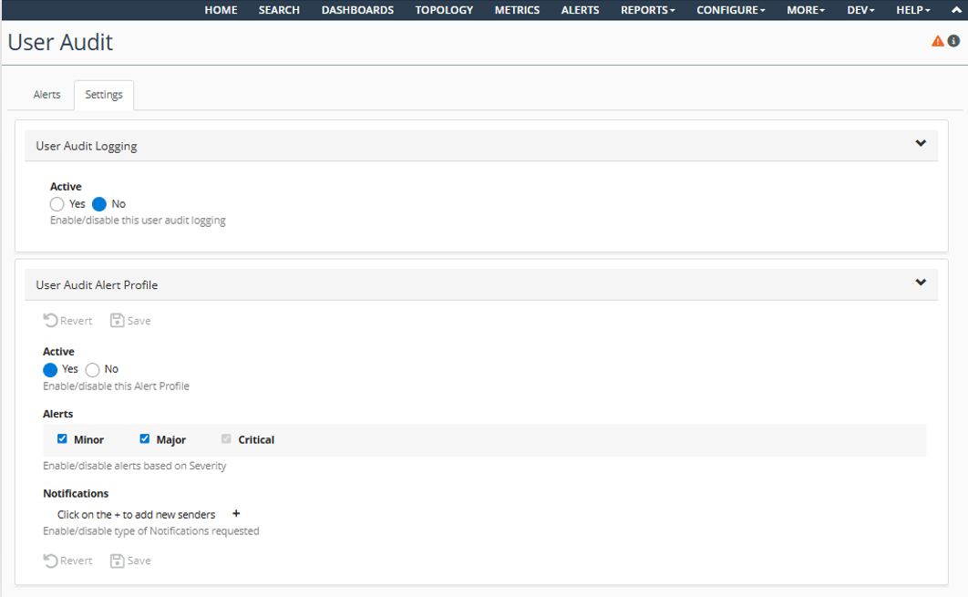 NetIM can also be configured to create user audit alerts for certain events that it tracks. In addition to displaying the alerts in the Web UI, NetIM can also be configured to send notification messages for the user audit alerts. The controls in the Audit Alert Profile section of the Settings page control the creation of these alerts and notifications. The Active flag controls whether any alerts are created. The Minor, Major, and Critical checkboxes specify whether alerts of those severities are created. For security reasons, the Critical checkbox cannot be disabled.