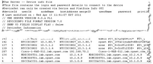 The following figure shows an excerpt of an exported device info file created using advanced export. It contains all of the device entry fields even though not all are shown. The password and privilegedPassword fields (as well as the commString field that is not shown) in an exported device info file are populated with encrypted strings.