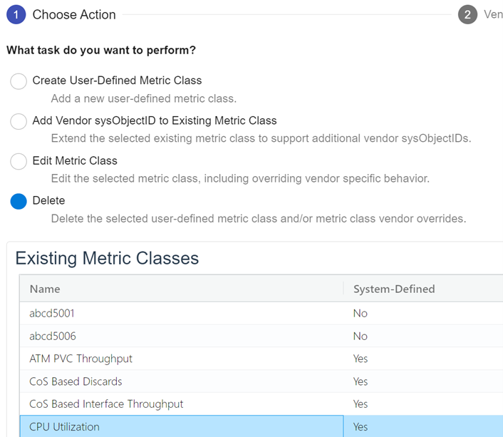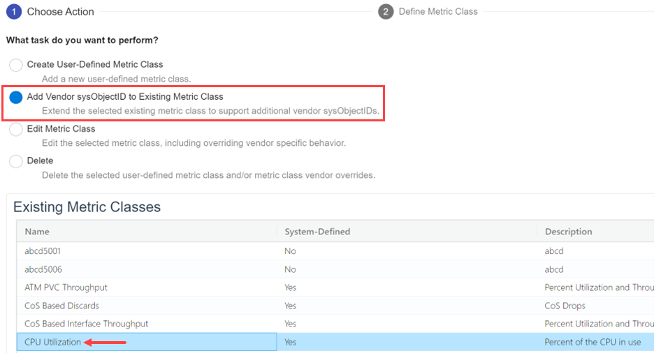 Select Add Vendor sysObjectID to Existing Metric Class on the main wizard page, and then select CPU Utilization and click Next.