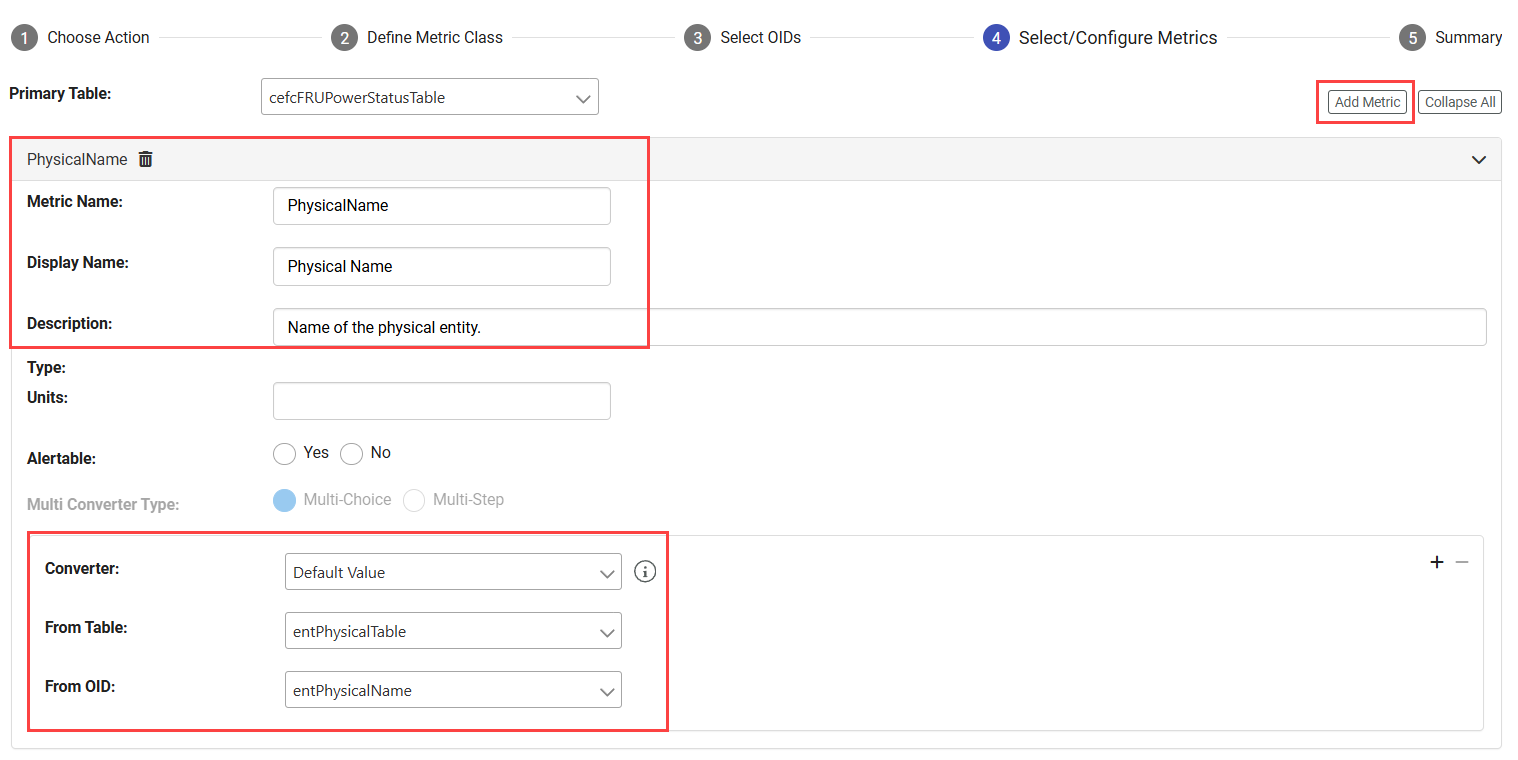 As you will notice, a metric for entPhysicalName is not added by default since this OID is from the secondary table entPhysicalTable. Click Add Metric to add this metric. Manually configure the metric name, display name, and description. Select the secondary table entPhysicalTable from the From Table drop-down list, and make sure From OID is entPhysicalName.
