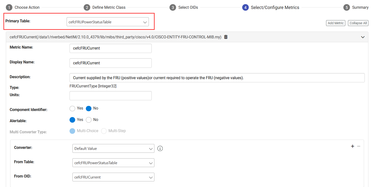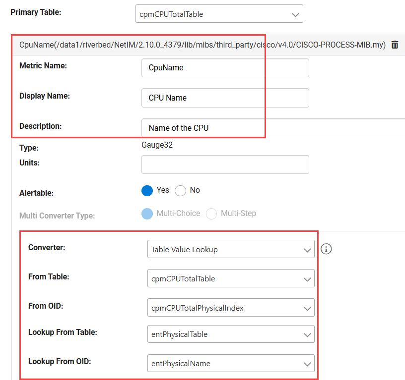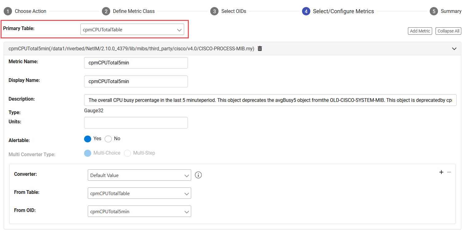 This means that you can create a custom metric class that gets CPU metric data from cpmCPUTotalTable and CPU name from entPhysicalTable. For your new custom metric class, you can select these two MIB tables to get the data and configure Table Value Lookup converter to merge them.
