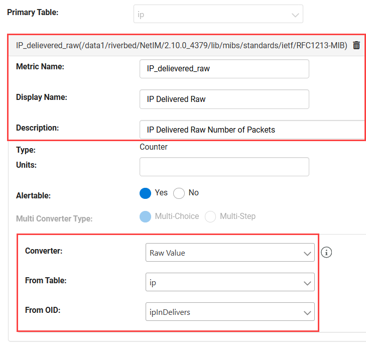 Let’s manually add two more metrics for cumulative values—one for ipInDelivers and another one for ipInReceives. For these metrics, you will use Raw Value converter as shown below. You can finish the wizard after configuring both additional metrics.
