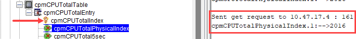 In the screenshot below, you see that the index for MIB table cpmCPUTotalTable is cpmCPUTotalIndex. When you poll the value for cpmCPUTotalPhysicalIndex, you get 2016. Note that cpmCPUTotalIndex is the index for this MIB table.