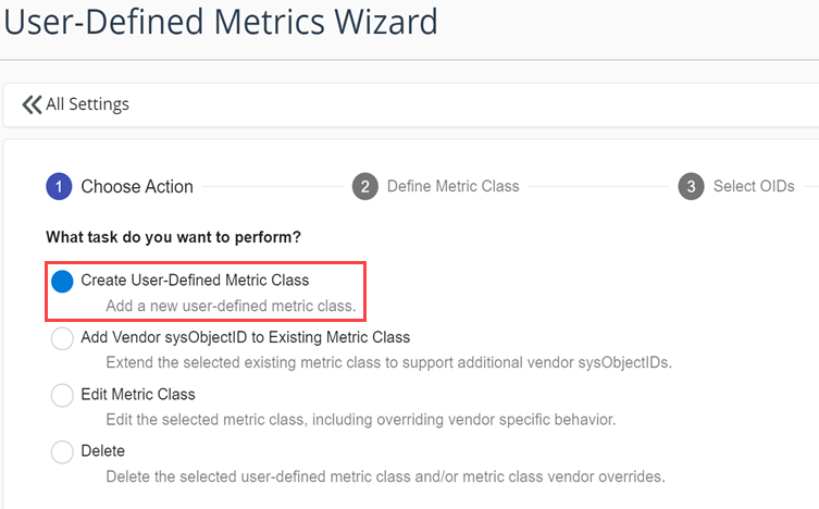 Typically for a user-defined metric class, each OID you select from a MIB table corresponds to a metric. The wizard allows creating additional metrics and customizing them.