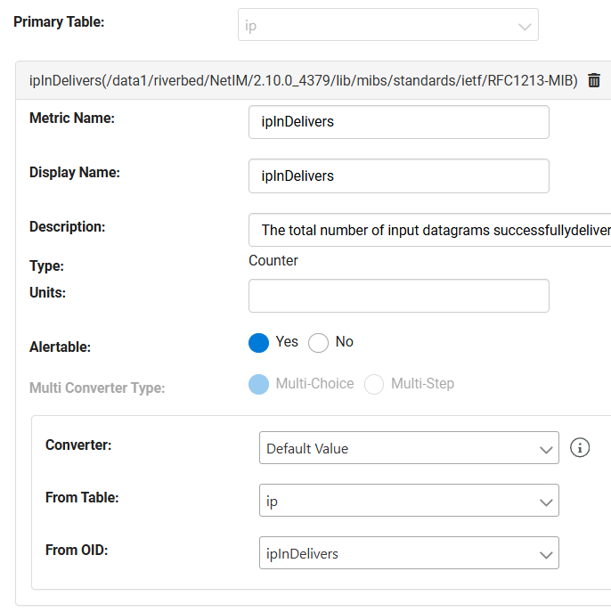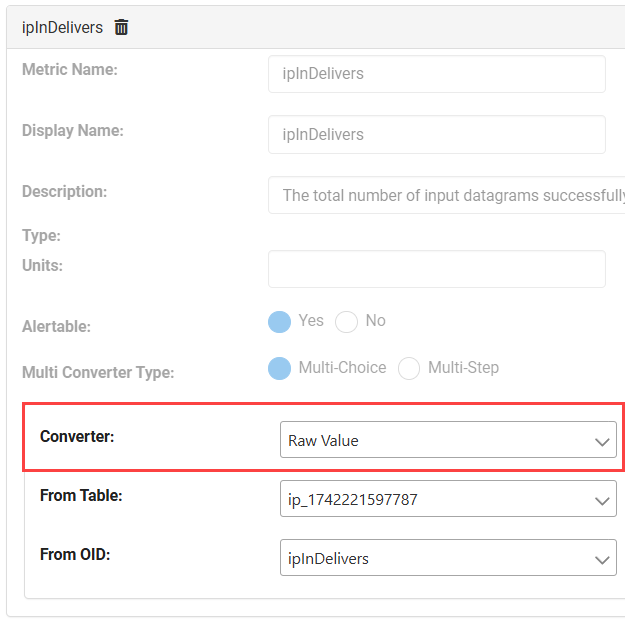 You will see a metric created and automatically populated for each OID from the primary table. Default Value converter is selected by default, which simply returns the polled MIB value. You can leave these as is for this example.