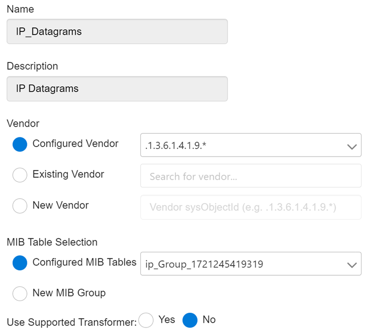 You are going to see the vendor and the MIB table you selected when creating the metric class. Since you simply want to change the converter, there is no need to make any changes here. But instead, if you were trying to add a new vendor support for this metric class, you could utilize Existing Vendor or New Vendor edit boxes. If a different MIB table needed to be polled for this vendor to populate this metric class, it is also possible to configure it by selecting New MIB Group.