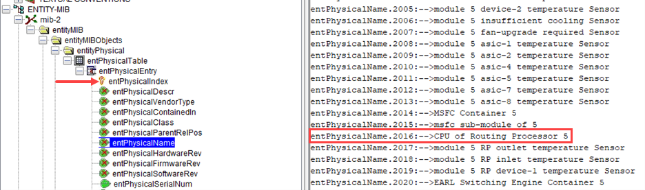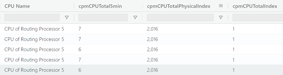 In the screenshot below, you see the entity physical name from entPhysicalTable for all the entities on this device. Note that entPhysicalIndex is the index for this MIB table, which is different from the index for cpmCPUTotalTable. So, it will not be possible to merge these two tables using a common index. You can also see that there is an entity with index value 2016, which is the value for cpmCPUTotalPhysicalIndex from table cpmCPUTotalTable. The name of this entity is CPU of Routing Processor 5. The value for cpmCPUTotalPhysicalIndex from table cpmCPUTotalTable can be used to merge the two tables.