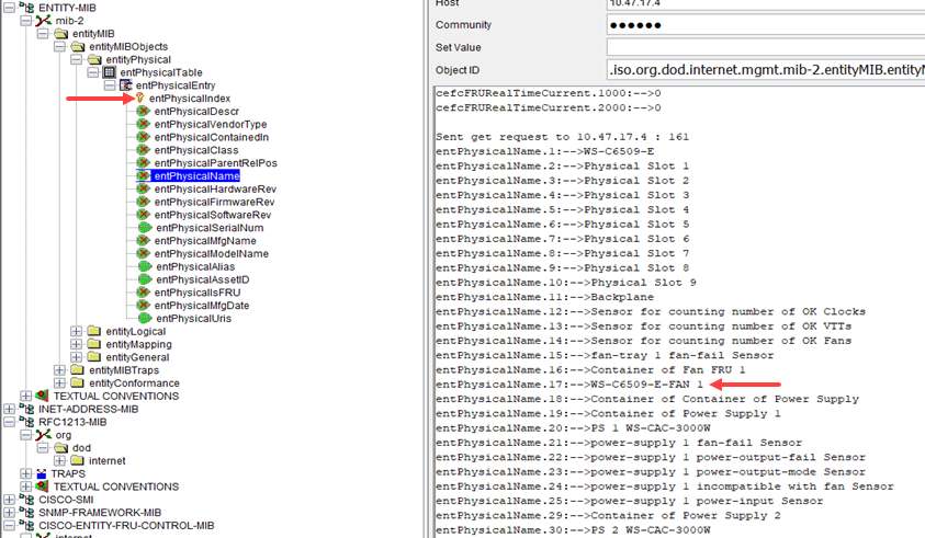 In the screenshot below, you can see the entity physical name from entPhysicalTable for all the entities on this device. Note that entPhysicalIndex is the index for this MIB table as well. For example, the row with index 17 has a value of WS-C6509-E-FAN 1.