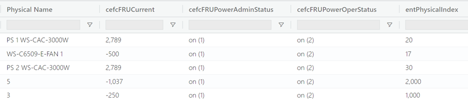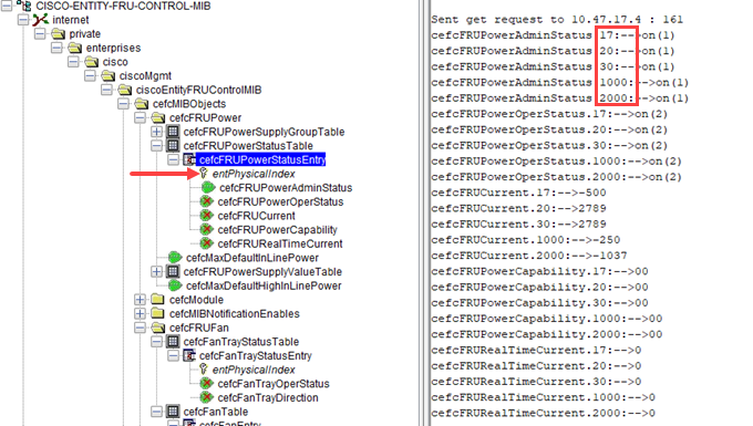 In the screenshot below, you can see admin status, operational status, and the current value as well as other parameters from cefcFRUPowerStatusTable. Note that entPhysicalIndex is the index for this MIB table and the components have index values 17, 20, 30, 1000, and 2000.