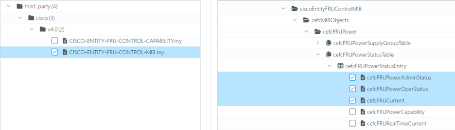 Select two tables and some OIDs from these tables. First find CISCO-ENTITY-FRU-CONTROL-MIB on the left panel and select it. Then find cefcFRUPowerStatusTable in the table hierarchy on the right panel and select the OIDs cefcFRUPowerAdminStatus, cefcFRUPowerOperStatus, and cefcFRUCurrent.