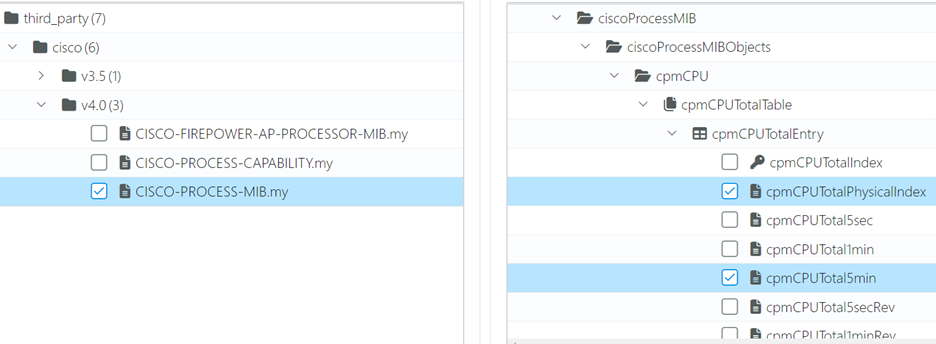 First find CISCO-PROCESS-MIB on the left panel and select it. Then find cpmCPUTotalTable in the table hierarchy on the right panel and select the OIDs cpmCPUTotalPhysicalIndex and cpmCPUTotal5min.