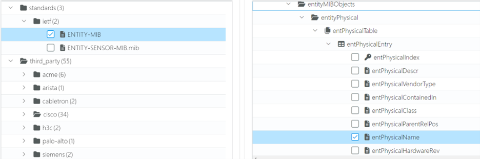 Find ENTITY-MIB on the left panel and select it. Find entPhysicalTable in the table hierarchy on the right panel and select the OID entPhysicalName.