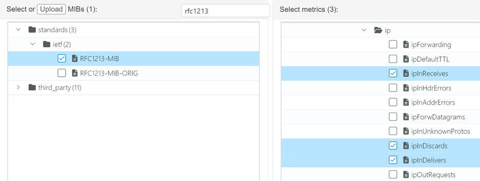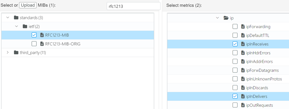 In the user-defined metrics wizard, select Create User-Defined Metric Class. Specify the settings and continue with the wizard. Find RFC1213-MIB on the left panel and select it. Then find ip table in the table hierarchy on the right panel and select the OIDs ipInReceives and ipInDelivers.