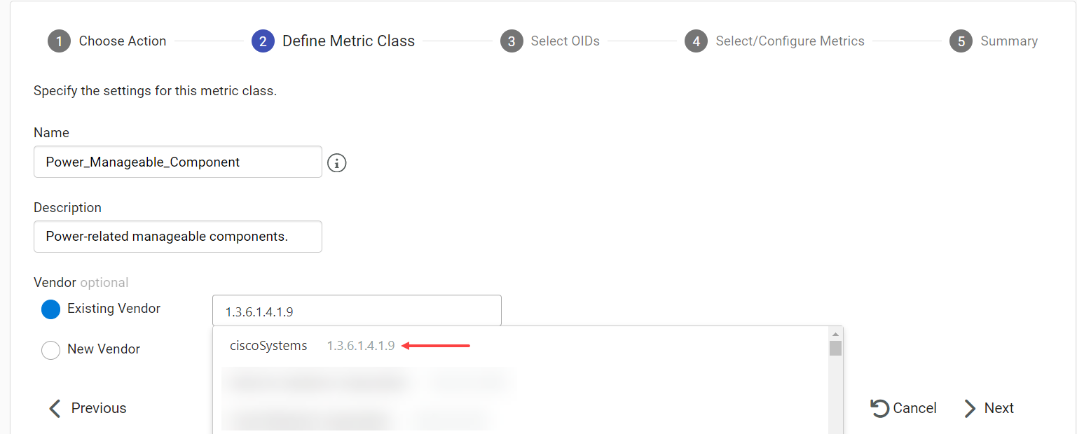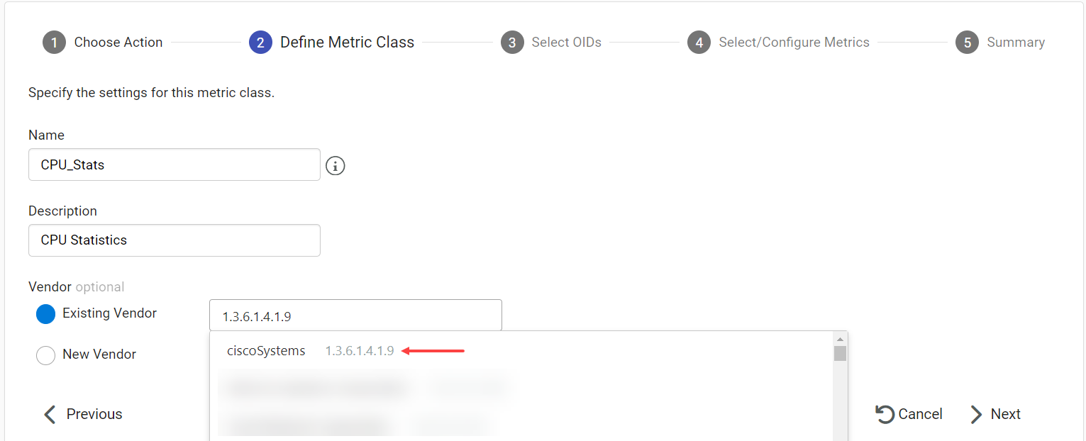 Configure the name and description for the new metric class. Select Existing Vendor. Search for Cisco by either typing in ciscoSystems, or typing in the sysObjectId. Select ciscoSystems as the vendor and click Next.