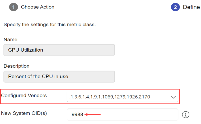 From the Configured Vendors drop-down list, select .1.3.6.1.4.1.9.1.1069,1279,1926,2170. As mentioned above these are the system object IDs for out-of-the-box supported Cisco wireless controller devices for CPU Utilization metric class. To add support for system object ID .1.3.6.1.4.1.9.1.9988, add 9988 to New System OID(s). Click Next and complete the wizard.