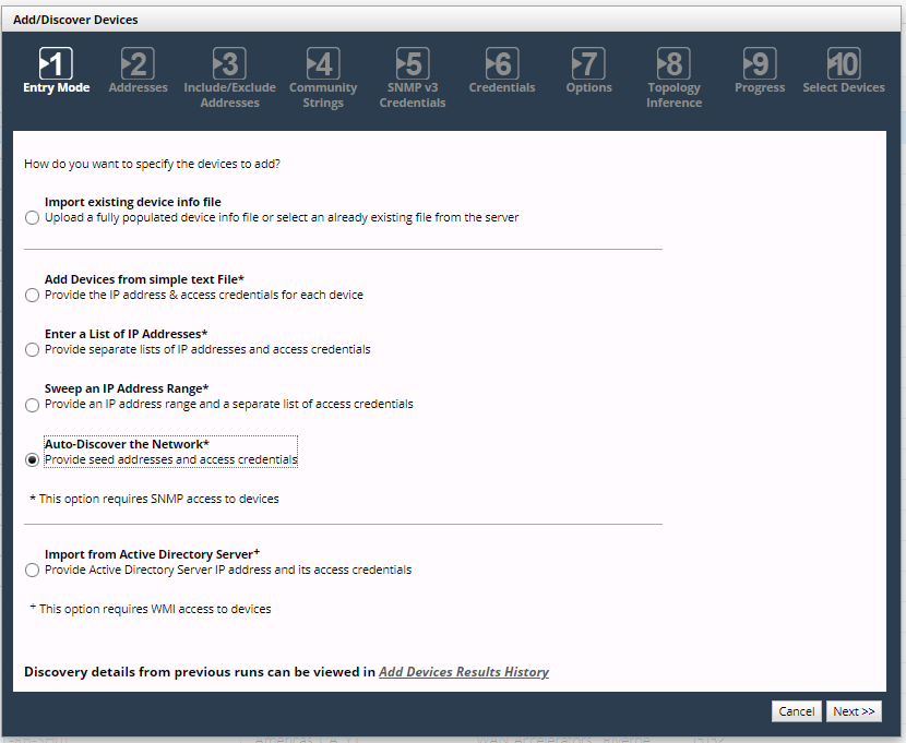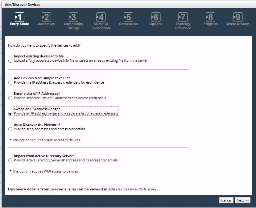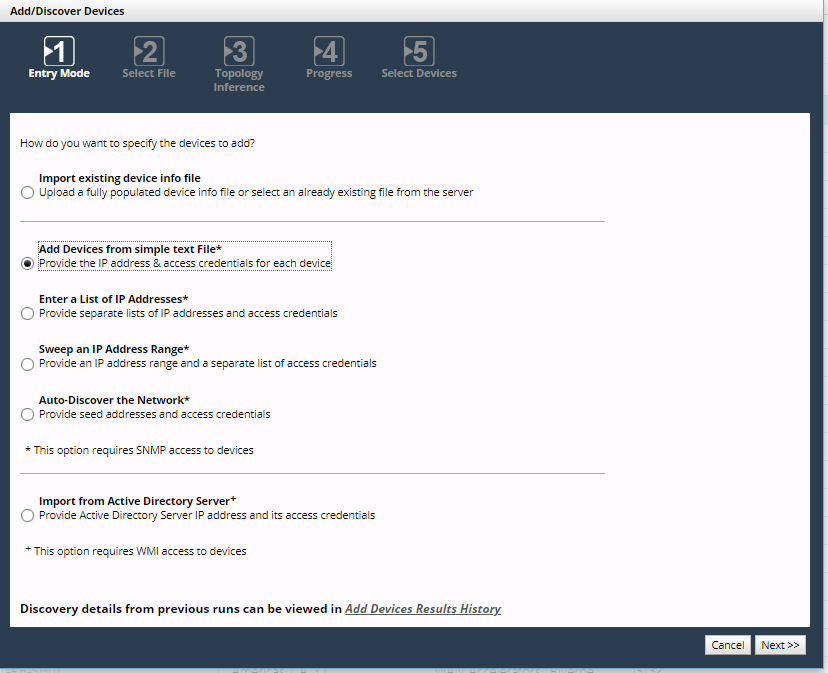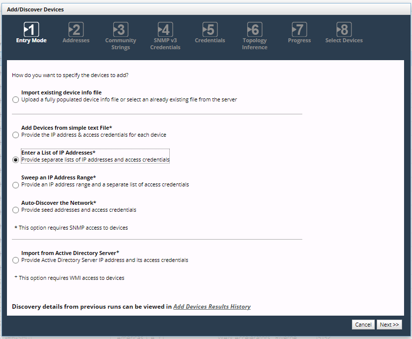 Depending on which entry mode you want to use, perform one of the following procedures to add devices. You can run the Add/Discover Devices wizard several times, using different entry modes.