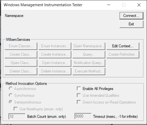 2. When the Windows Management Instrumentation Tester dialog box appears, click Connect. The following screen appears.