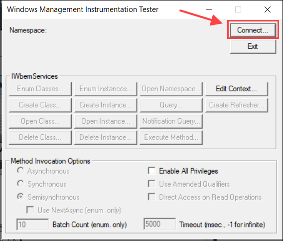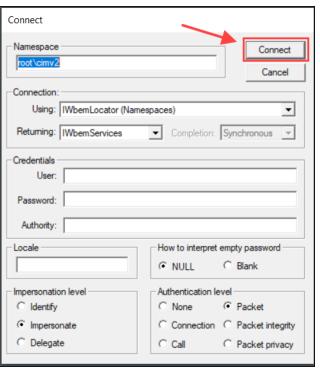 2. When the Windows Management Instrumentation Tester dialog box appears, click Connect, as shown in the following screen.