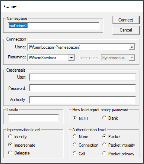 – Namespace as \\<wmi-host-or-server>\root\cimv2.
