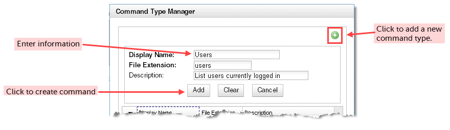 6. Click the add icon in the Command Type Manager to add a new command type. Enter the following information for the command type: