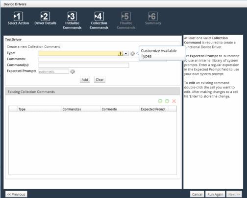 4. Perform the steps in the applicable procedure until you reach the Collection Commands. After you create the command type, return to your procedure and finish creating/modifying the device driver.