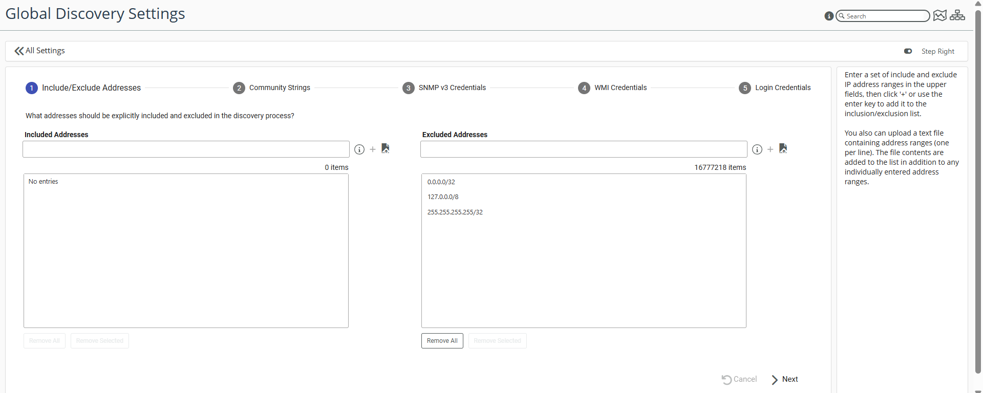 3. Enter the IP addresses and address ranges that should be explicitly included or excluded from all autodiscovery processes.