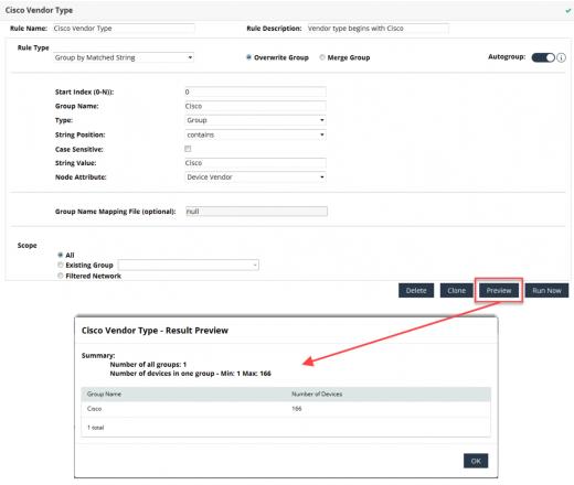 The following figure shows an example of a single node group creation rule. This grouping rule will create one group named “Cisco Vendor Type” with devices that have a Vendor Type that starts with “Cisco.” A preview of the grouping rule shows that there are 166 devices in our network that match this criteria.