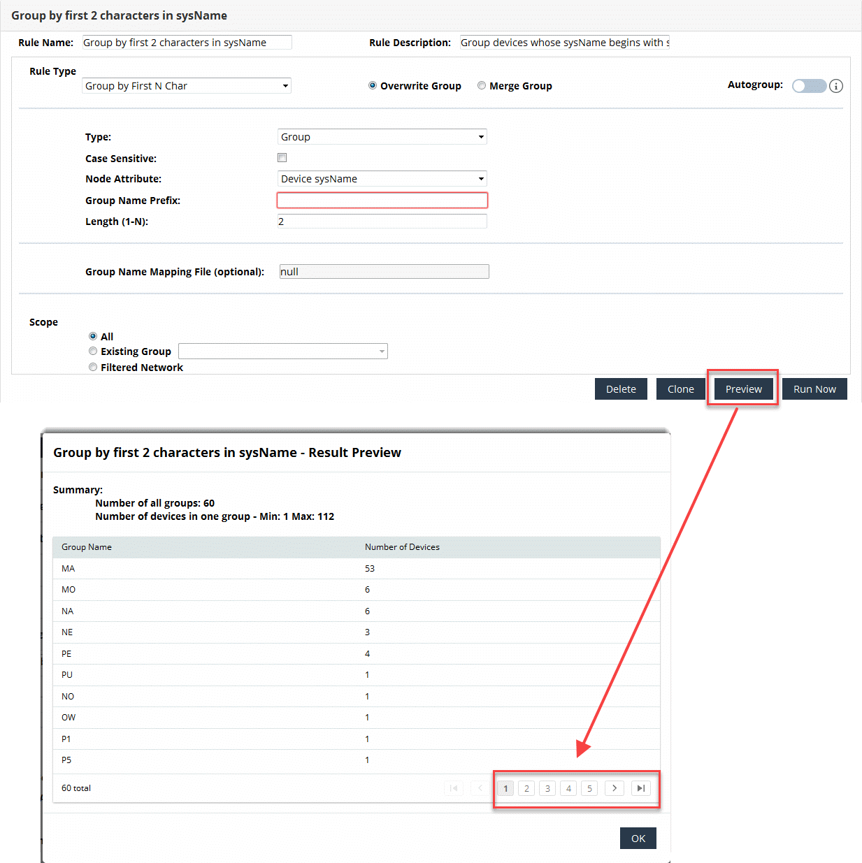 The following figure shows an example of a multiple node group creation rule. This grouping rule will create a group for each sysName that begins with a different two character string. Devices with sysNames that begin with the same two characters are placed in the same group. In the Preview, notice that there are multiple pages of results.