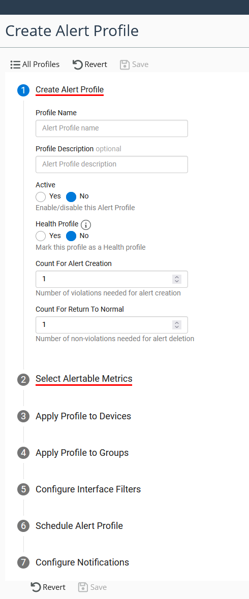 Configure the settings for the alert profile, then save your settings to the server, or revert to discard your current changes.