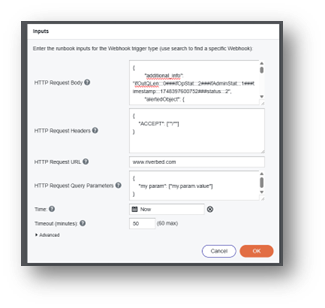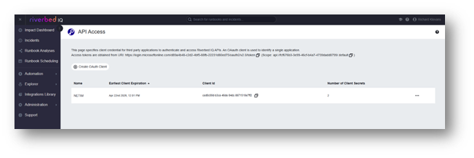 When you enable this integration, NetIM uses OAuth2 authentication to securely connect to Riverbed IQ. Once connected, NetIM sends each alert as a JSON notification message to IQ. A webhook in IQ receives the message and automatically triggers a runbook. The runbook processes the JSON data, converts it to the required format, and forwards it to your destination system.