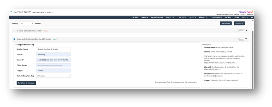 4. Choose the Riverbed IQ sender you configured earlier.