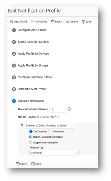 Riverbed IQ configuration for notification profile