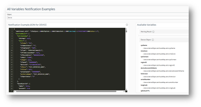 If you're developing or modifying IQ runbooks, you'll want to know what JSON messages NetIM sends to IQ. To see examples, choose Help > API Documentation > Notification Integration: All Variables Notifications Examples.