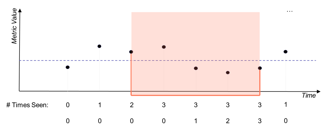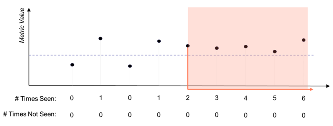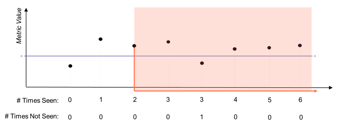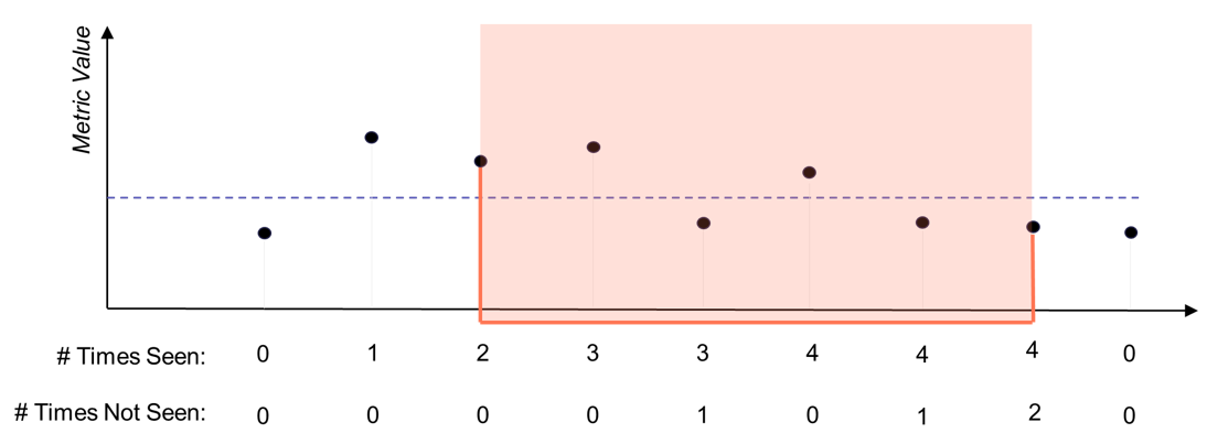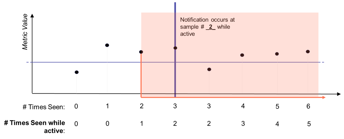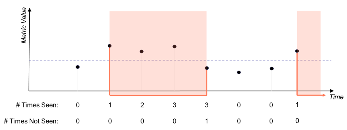 In this example, the alert ends only after two consecutive non-violating samples occur. The “# Times Not Seen” counter resets whenever a violating sample is received.