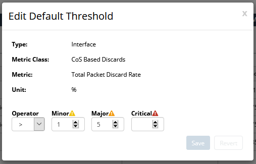 The Default Thresholds page allows you to define the default thresholds used for NetIM’s default alerts.