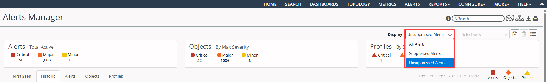 One of the first things you will notice is a drop-down option on the alerts page. By default, the drop-down choice is to show Unsuppressed Alerts. The three options are shown below.