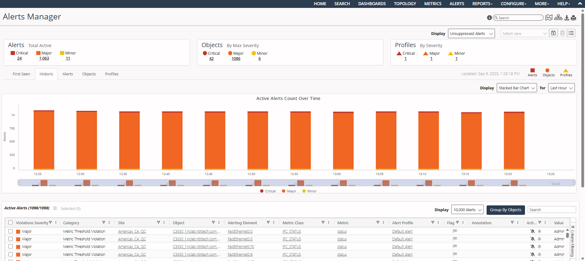 Alerts are generated when a polled metric value violates a threshold violation value and the operator that was configured for that metric. To see all the alerts generated for the network that is being monitored, go to the Alerts page.