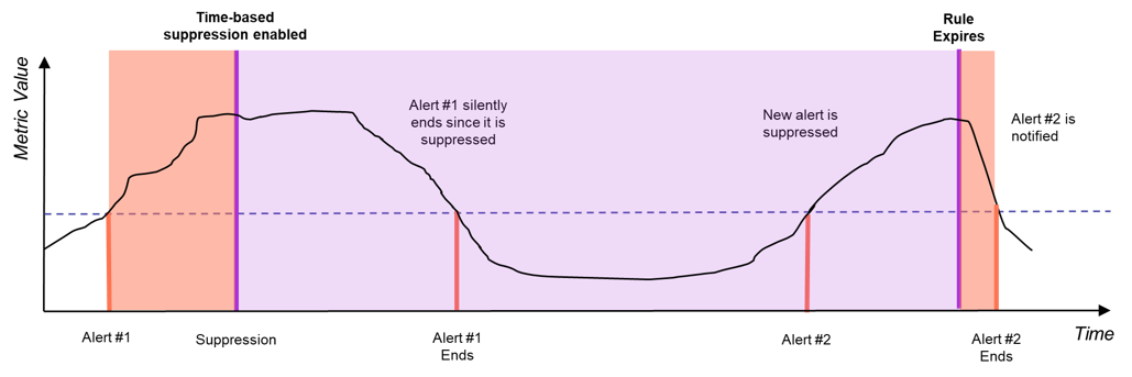 When time-based suppression rules are applied, alerts for the same <Profile, Object, Metric Class, Metric Field> will automatically be suppressed until the time when the rule expires. In the example below, Alert #2 is for the same <Profile, Object, Metric Class, Metric Field> as Alert #1 and is automatically suppressed by the time-based rule. When the rule expires, Alert #2 will become active and its associated notification messages will be sent.