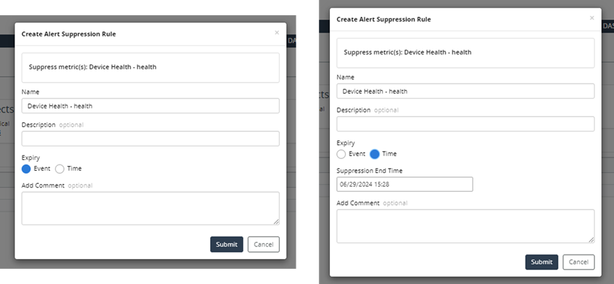 After clicking on the suppression icon, the dialog box for creating the suppression rule will be displayed. You can select either “Event” or “Time” for the Expiry type. If “Time” is chosen, the Suppression End Time will also need to be specified.
