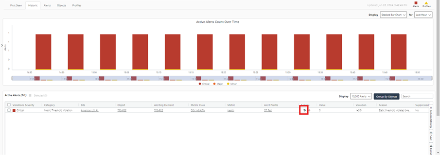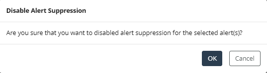 To remove suppression, click the bell icon and it will delete the alert suppression rule and will also disable suppression on that alert. This opens a dialog box to confirm your intentions. Click OK and it will remove the alert suppression rule if that was the only element associated with that rule. In addition to removing the alert suppression rule, it will disable suppression; that is, it will enable notification of those alerts if they happen again in the future. The next time the alert happens, you will see the alert appear in the alerts manager. (This depends, based on the poll frequency and the time when the violation really occurs based on the metric value crossing any bounds).