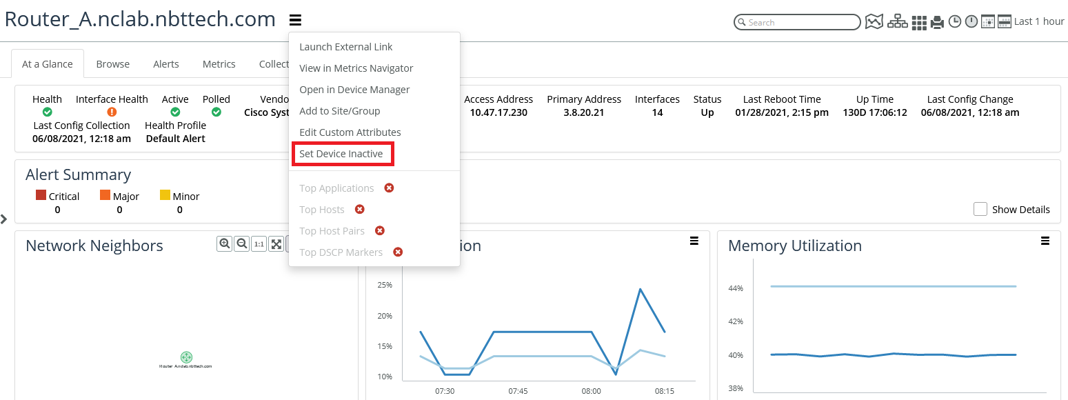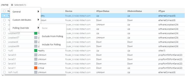 You can also access and control interface polling overrides associated with a device’s interfaces from the Device page > Browse tab > Interfaces table, as shown in the following screen.