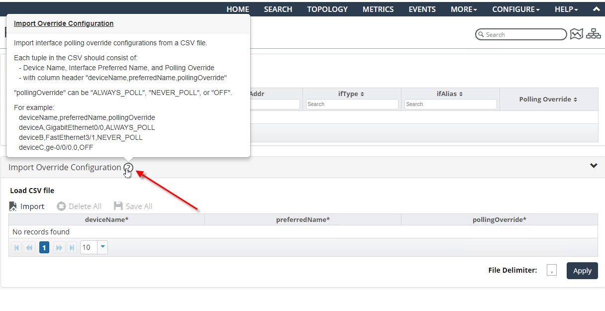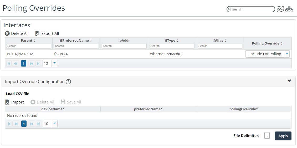 Polling overrides provides high-granularity control over whether to poll individual interfaces. The polling override is the highest priority control over whether an interface will be polled by the NetIM poller (provided the NetIM poller has sufficient resources). The interface polling override supports three states: