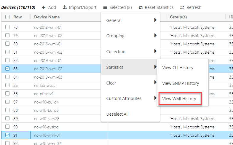 The Device Manager provides detailed collection status for each device from the Statistics > View WMI History option, as follows.