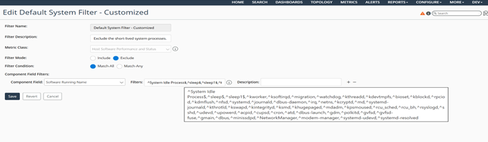 To edit a metric component filter, click the pencil icon. Once saved, the changes take effect in upcoming polling cycles. The filter name and metric class are unique and cannot be changed.