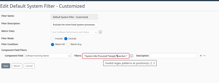 Hover over a filter field to view its full content. If a regular expression has a syntax error, it will be highlighted on hover, and the system will prevent saving until the error is resolved.